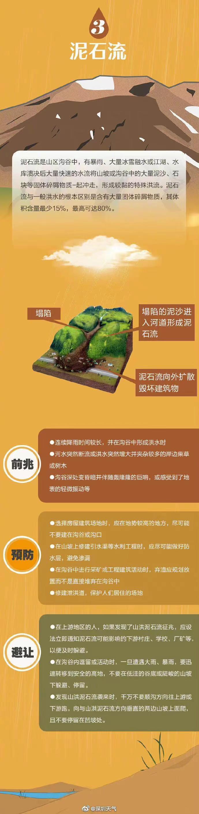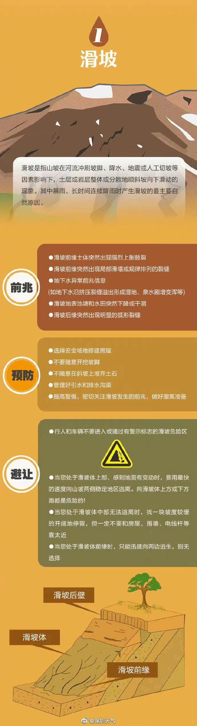 所以,深圳現(xiàn)已發(fā)布的地質(zhì)災(zāi)害氣象風(fēng)險橙色預(yù)警,表示24小時內(nèi)地質(zhì)災(zāi)害發(fā)生的風(fēng)險高。其中地質(zhì)災(zāi)害主要包括滑坡、崩塌和泥石流等。