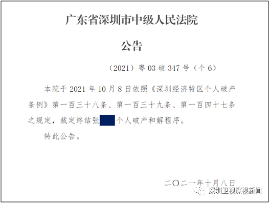 10月8日,深圳市中級(jí)人民法院形成有關(guān)民事裁定書指出,經(jīng)審查,該案和解程序規(guī)范完整,和解過程公開透明,和解協(xié)議系債務(wù)人與債權(quán)人的真實(shí)意思表示,未損害國(guó)家利益、社會(huì)公共利益或者他人合法權(quán)益,亦不違反法律、行政法規(guī)的強(qiáng)制性規(guī)定;并裁定終結(jié)張某個(gè)人破產(chǎn)和解程序。
