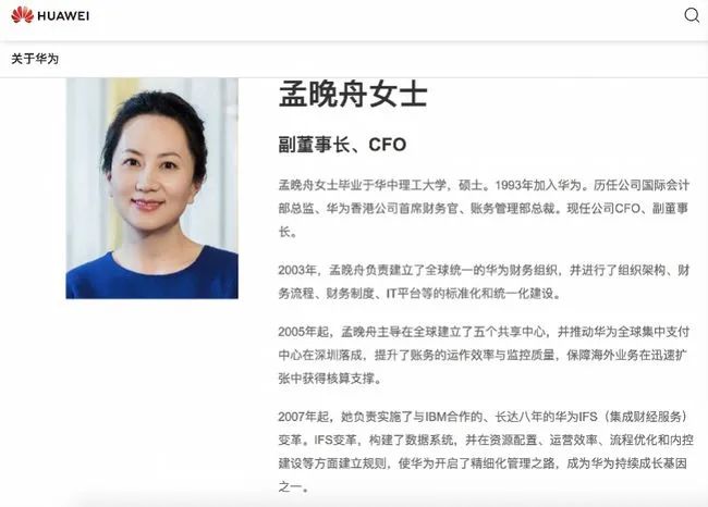 華為官網(wǎng)顯示,孟晚舟目前仍擔(dān)任公司副董事長(zhǎng)、CFO一職。