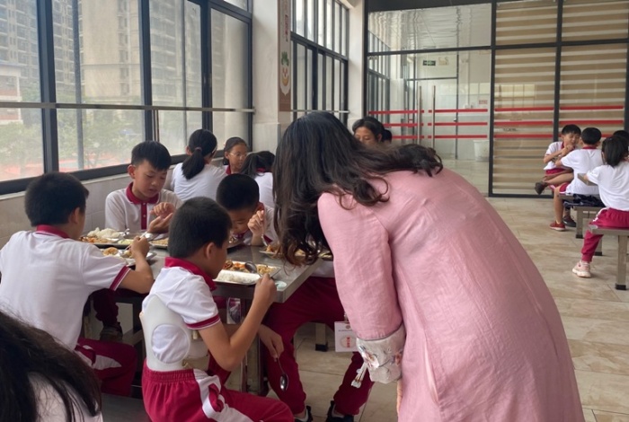 中午放學后,學生在整潔衛(wèi)生的校園食堂里文明排隊,安靜就餐。學校值日教師在飯?zhí)弥羞M行巡查管理,并陪同學生就餐,及時監(jiān)督菜品安全和營養(yǎng)健康,關注學生是否吃飽。午餐結束后,學生在班級進行自主閱讀與午休,值班教師巡班看護,并隨時給予學生生活上的關懷和指導。