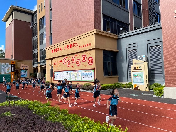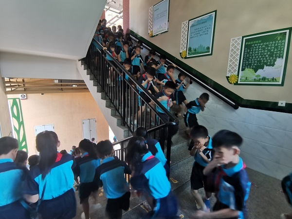 演練前,各班主任對學生進行了消防安全教育,提醒學生有秩序地從走廊、樓梯右側低頭、彎腰、捂口鼻地撤離教學樓,到操場匯合。