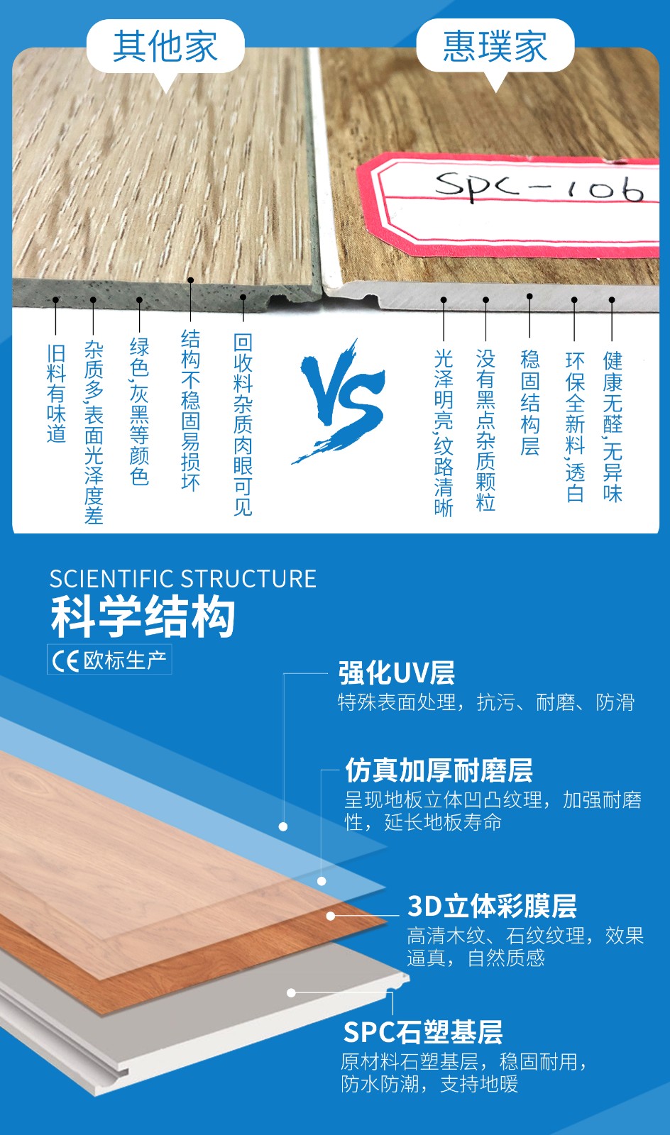 惠璞SPC鎖扣地板主要出口歐美等國(guó)家,品質(zhì)通過(guò)CE、SGS標(biāo)準(zhǔn)認(rèn)證,健康環(huán)保零甲醛、不含鉛。